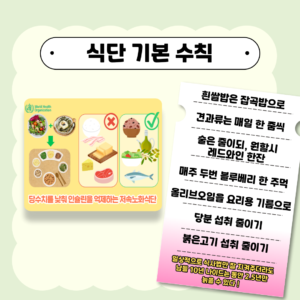 - 규칙적인 시간에 식사를 하여 혈당을 안정적으로 유지하고, 과식을 예방합니다.