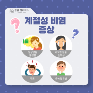 다. 주요 증상 계절성 비염의 증상은 감기와 유사하여 혼동하기 쉽지만, 발열이 없고 특정 계절에 반복적으로 나타난다는 점에서 차이가 있습니다.