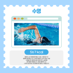 - 고려사항: 수영장 시설 이용이 필수적이며, 영법에 따라 칼로리 소모량 차이가 크다. 물에 대한 적응력과 기본 영법 습득이 필요하다.