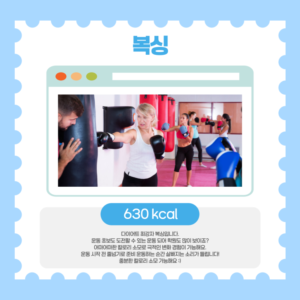 강점: 짧은 시간 내에 많은 칼로리를 소모할 수 있어 바쁜 현대인에게 효과적이며, 스트레스 해소에도 도움을 준다.