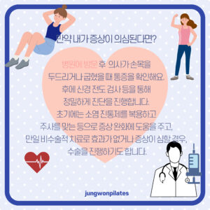 - 저림 및 감각 둔화: 엄지, 검지, 중지, 약지의 절반에 해당하는 부위가 저리거나 화끈거리는 통증이 느껴진다. 특히 밤에 증상이 심해져 수면을 방해하는 경우가 많다.