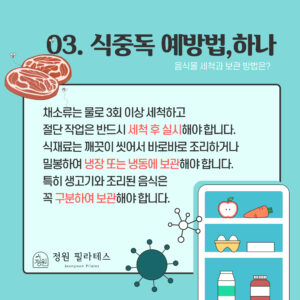 - 개인 위생 철저: 화장실 사용 후, 조리 전후에는 반드시 비누를 사용하여 30초 이상 손을 깨끗이 씻어야 한다.
