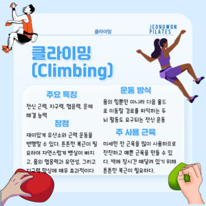 클라이밍은 단순히 힘으로 오르는 것이 아니라 경로를 파악하는 두뇌 활동과 균형 감각을 필수적으로 요구한다. 이는 전신의 잔 근육과 지구력을 동시에 발달시키며, 높은 성취감을 제공하여 운동의 재미를 느끼게 해준다는 장점이 있다.