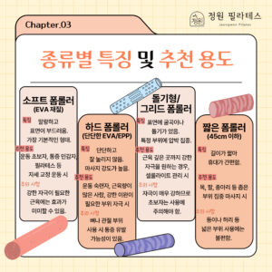 폼롤러는 경도(단단함), 재질, 표면 형태에 따라 그 자극의 강도와 용도가 명확히 구분됩니다. 사용자들은 자신의 신체 상태에 맞는 도구를 선택해야 부상을 방지하고 효과를 극대화할 수 있습니다.