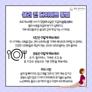운동 전략: 격렬한 운동은 신체에 과도한 산화 스트레스를 줄 수 있다. 혈액 순환을 촉진하여 생리통을 완화할 수 있는 스트레칭, 요가, 가벼운 산책이 적합하며, 폼롤러를 활용해 하체 부종을 관리하는 것이 효과적이다.