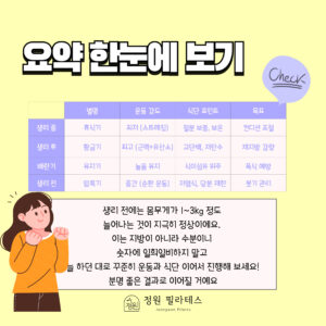 운동 전략: 관절과 인대가 호르몬 영향으로 느슨해질 수 있어 무거운 중량을 치는 운동은 부상 위험이 있다. 중저강도의 필라테스나 조깅을 통해 심리적 안정감을 유지하고 혈류 흐름을 개선하여 부종을 방지해야 한다.