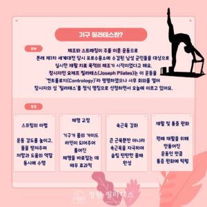 주요 효능: 운동의 흐름(Flow)이 끊기지 않고 리포머의 다이내믹한 근력 운동과 캐딜락의 정적인 교정 운동을 병행할 수 있어 운동 효율이 극대화된다. 신체의 불균형을 다각도에서 체크하고 수정할 수 있어 프로 운동선수부터 일반인까지 폭넓은 개인별 맞춤 처방이 가능하다.