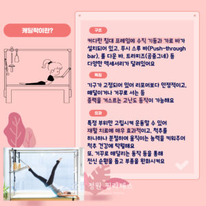 병원 침대에서 고안된 캐딜락은 중력을 거스르는 다양한 자세를 통해 척추와 골반의 정렬을 바로잡는 데 탁월한 효능을 보인다.