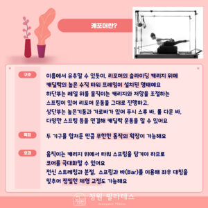 최근 현대적 필라테스 환경에서 가장 선호되는 캐포머는 리포머와 캐딜락의 기능을 단일 프레임 안에 통합한 하이브리드 기구다.