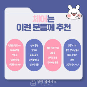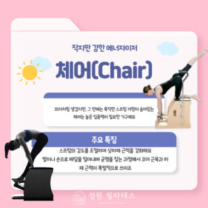 의자 형태의 외형을 가진 체어는 좁은 지지면을 활용하여 높은 집중력과 근력을 요구하는 ‘작은 거인’ 같은 기구이다.